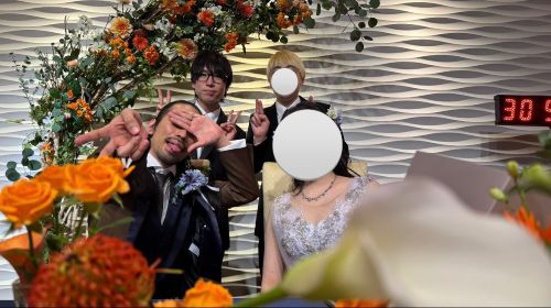 「かが屋」の加賀翔さんが、式の正カメラマンとして両家の集合写真やお二人の写真を撮影しています。